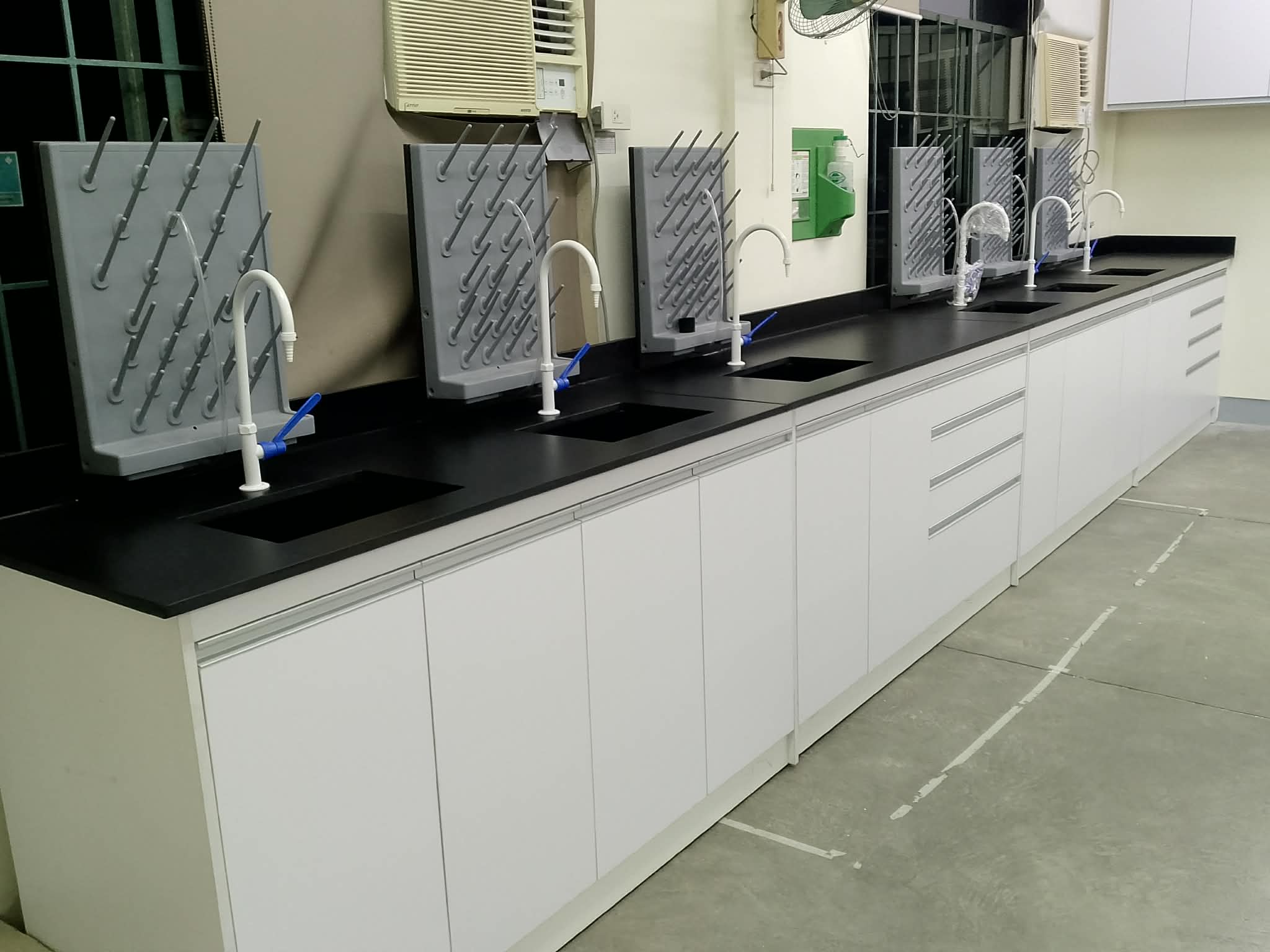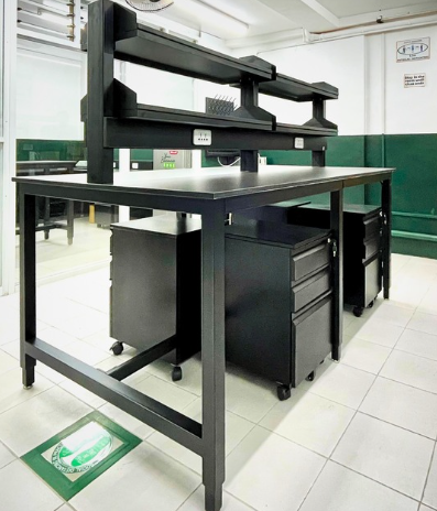 Workbenches featuring overhead cabinets and integrated utility fixtures.
